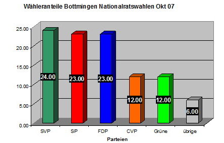 Die SVP konnte ihre Wähleranteile in Bottmingen kontinuierlich steigern und ist nach den Nationalratswahlen 07 mit 23.6% wählerstärkste Partei in Bottmingen. Die SP kommt noch auf 23.2% und die FDP auf 23.1%. CVP 12.5% und Grüne 12%. Übrige 5.7%.